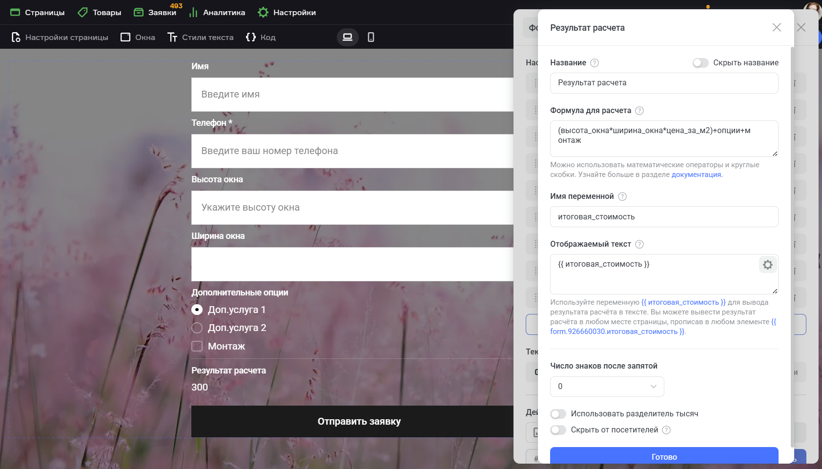 Поле Результат расчетов поддерживает математические операции и самовыполняемый JS;